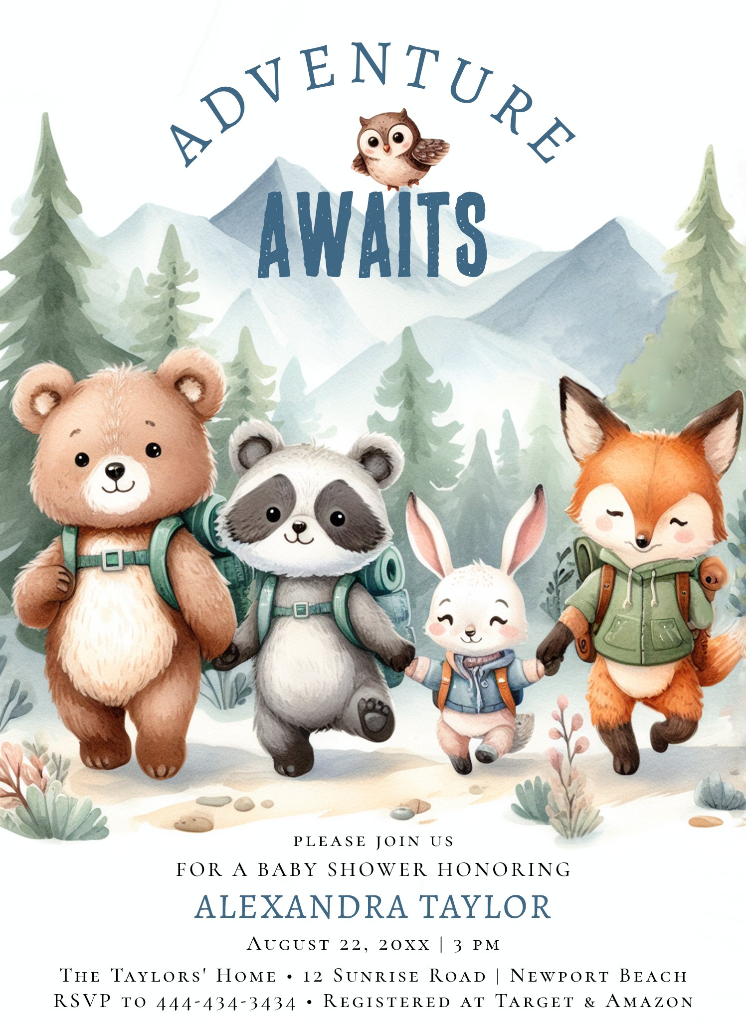 A cute but elegant boy baby shower invitation with a woodland adventure theme, featuring a watercolor illustration of adorable woodland animals in hiking gear, with backpacks and holding hands, walkin